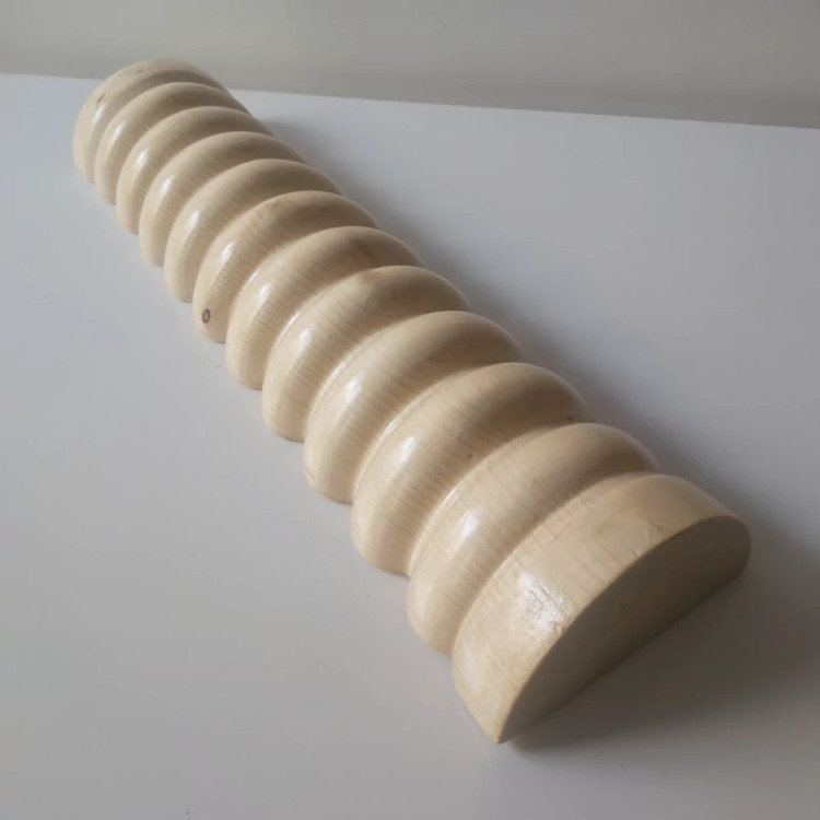 این بالشت چوبی از بهترین نوع چوب وارداتی ساخته شده است که از لحاظ فرم و شکل کاملن با نمونه ی اصلی مطابقت دارد . دارای ده موج متقارن و شیار زیر برای جای دست می باشد که برای انجام حرکات ترکیبی و قرار دادن استیک موجی یا همان وردنه مناسب می باشد .
